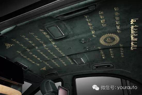 而桦木则用来装饰中控台,门窗扶手以及方向盘等部件。在车顶上,则是用金丝线手工绣上的《古兰经》。但是按照TOPCAR的说法,他们也不知道啥意思,只是比着原样绣上。