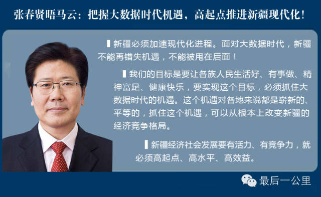 张春贤指出,新疆要实现与全国同步建成小康社会的目标,必须加速现代化进程。面对大数据时代,新疆不能再错失机遇,不能被甩在后面!我们的目标是要让各族人民生活好、有事做、精神富足、健康快乐,要实现这个目标,必须抓住大数据时代的机遇。这个机遇对各地来说都是崭新的、平等的,抓住这个机遇,可以从根本上改变新疆的经济竞争格局。新疆经济社会发展要有活力、有竞争力,就必须高起点、高水平、高效益。新疆与阿里巴巴集团的合作是高起点的,可以发挥支撑很引领作用,在竞争中走到前列。