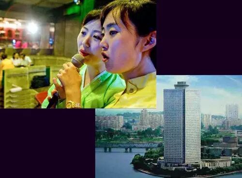 羊角岛饭店是一个中国人扎堆的地方,还是平壤乃至朝鲜唯一的“红灯区”。地下一层有一个桑拿洗浴。消费以欧元计算,最便宜的头部按摩,45分钟要25欧元,看场的中国人说,现在小姐还没下来,只能洗浴。朝鲜把羊角岛辟为接待中国人的特区,准许色情业存在。左图为羊角饭店内景,右图为羊角饭店外景。
