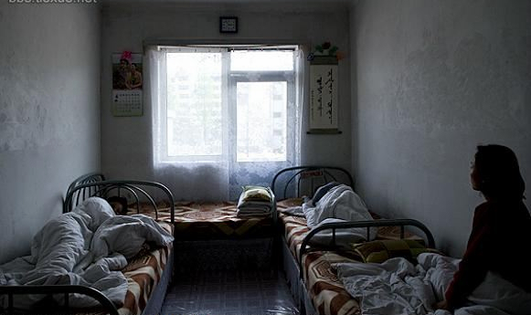 朝鲜医院住院,被褥均由病人自己从家带,床上白布是为了拍照好看,临时铺的